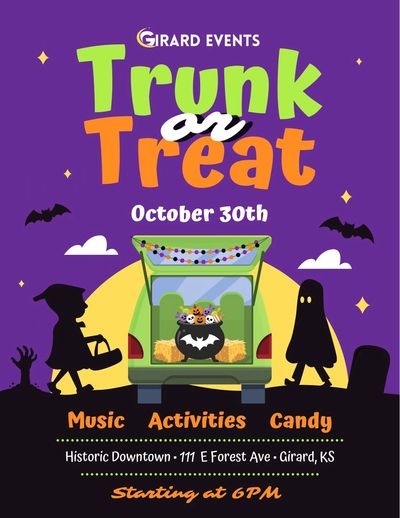 During Trunk or Treat, local businesses, organizations, and community members decorate the trunks of their cars with creative, spooky, or fun themes and hand out treats to children as they go from trunk to trunk. The event encourages costume creativity, family participation, and lots of laughter, making it a highlight of the fall season in Girard.